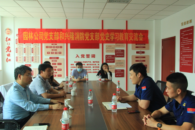 首先開始的是黨史學習教育交流會,雙方就黨建品牌培育工作進行了交流,興隆消防黨支部在建鄴消防救援大隊“紅門黨旗紅”黨建品牌建設牽引下,強堡壘、抓作風、帶隊伍,保障了中心任務。園林公司黨支部以“鑄紅心·享園林”黨建品牌建設為牽引,凝聚思想、開拓創(chuàng)新,推動公司高質量發(fā)展。之后,雙方就黨史學習教育開展情況進行了交流,并提出要進一步發(fā)揮雙方優(yōu)勢和特長,加強交流與協(xié)作,雙向促進、共同提高。