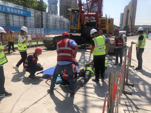 本次應(yīng)急演練活動模擬施工現(xiàn)場履帶式起重機(jī)在作業(yè)過程中由于鋼絲繩斷裂,吊物從高處掉落倒下,不幸將地面一名作業(yè)人員腳部砸傷的事故?,F(xiàn)場專職安全員發(fā)現(xiàn)后第一時間向應(yīng)急救援指揮部匯報,應(yīng)急救援指揮部立即啟動應(yīng)急預(yù)案,各應(yīng)急救援小組接到救援命令后,迅速跑向事故地點,對受傷人員開展救援工作,同時拉起警戒線,保護(hù)現(xiàn)場。救援人員按預(yù)案分工,有條不紊地實施清障、包扎、傷員擔(dān)架固定、運(yùn)送上救護(hù)車等一系列動作。本次演練活動,增強(qiáng)了員工的安全操作意識,提高了快速反應(yīng)能力、應(yīng)急救援能力以及協(xié)同作戰(zhàn)能力。