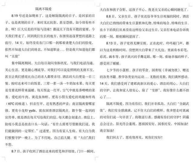 集中醫(yī)學(xué)觀察即將結(jié)束前,酒店工作人員收到了一份飽含深情的離別“禮物”。這是一封來自剛剛結(jié)束觀察生活、離開酒店順利歸家的市民朋友的感謝信,他用樸實真摯的語言回顧了與家人在酒店里生活的點點滴滴,表達了對集中觀察點指揮部、各工作組及國青酒店的感謝與祝福。