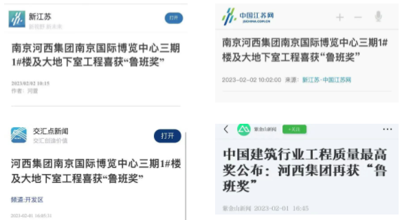 編者按:企業(yè)高質(zhì)量發(fā)展,離不開高品質(zhì)的產(chǎn)品。2022—2023年度第一批中國(guó)建設(shè)工程魯班獎(jiǎng)名單近日公布,由河西集團(tuán)投資,集團(tuán)新城公司代建的南京國(guó)際博覽中心三期1#樓及大地下室工程榜上有名。對(duì)此,交匯點(diǎn)新聞、中國(guó)江蘇網(wǎng)、紫金山新聞等省市多家主要媒體進(jìn)行了專題報(bào)道。